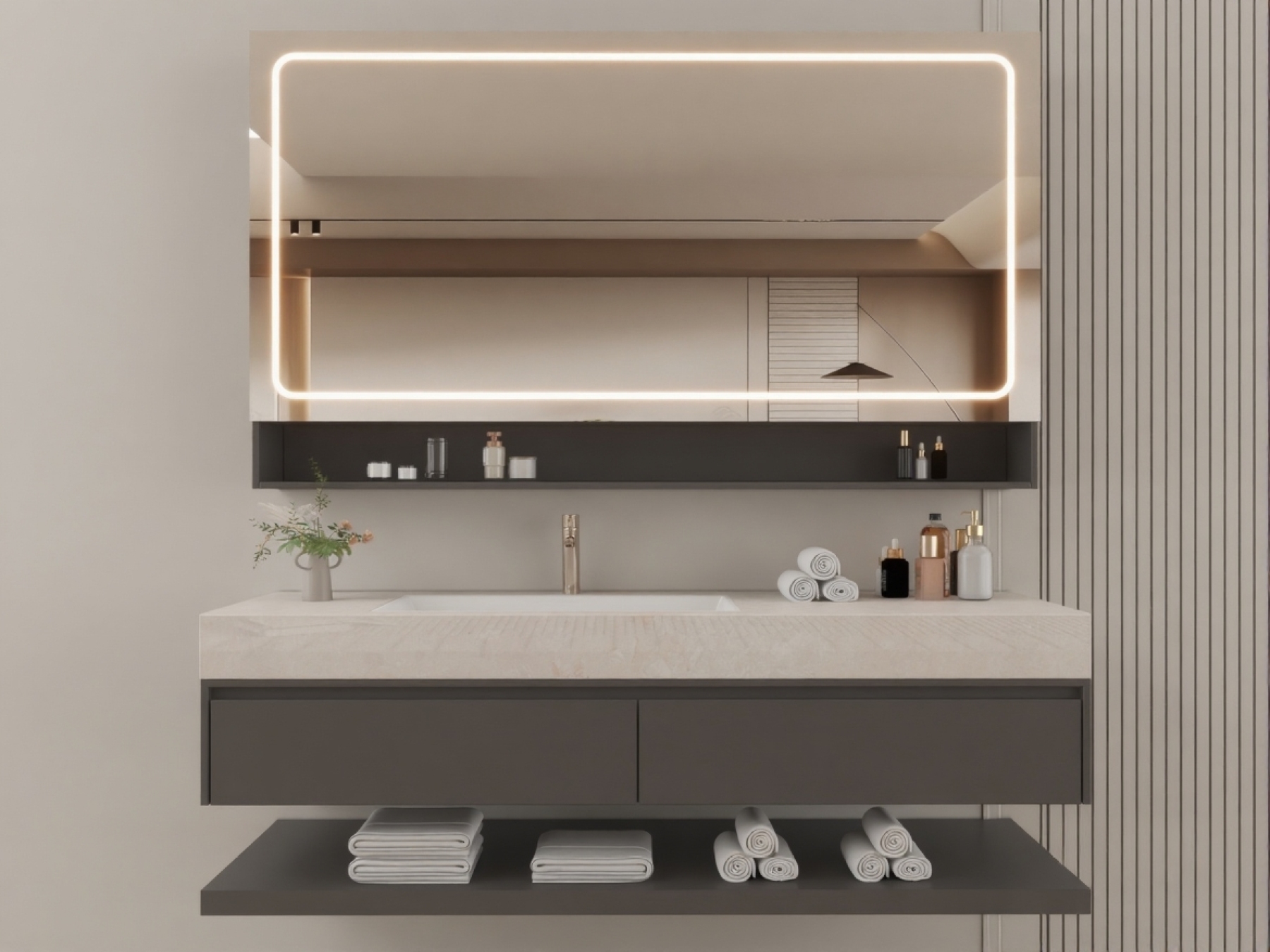 Also, these vanities come in many finishes — from sleek modern gloss to warm wood grain or matte textures. This variety lets you match the vanity to your bathroom’s style, whether modern minimalist or classic. In addition, both floor-standing and wall-mounted (floating) designs are often available, giving you layout flexibility.