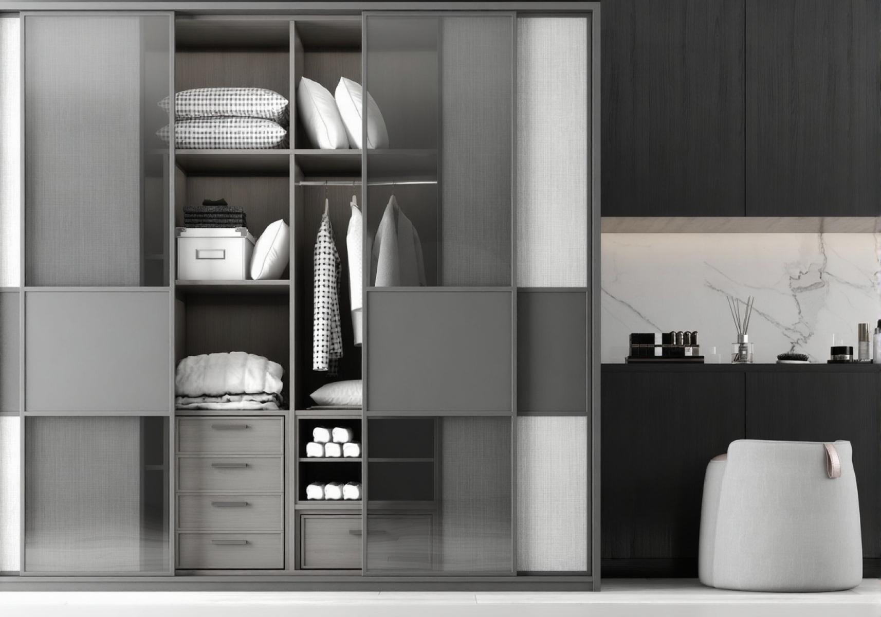 Next, you can tailor the interior to fit your life perfectly. Our wardrobes come with adjustable shelves and hanging rods. For instance, you can configure spaces for long dresses, short shirts, or folded sweaters. Besides that, you can add accessories like drawers or shoe racks. This flexibility ultimately allows you to create a storage solution that is uniquely yours.